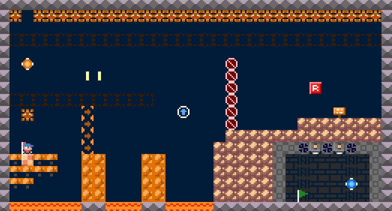 This level features lasers, conveyors, spikes, cannons, trampolines and stompers in an all-new perilous setting.